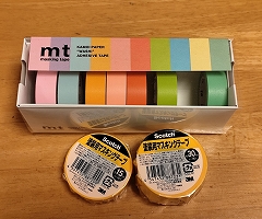 箱や袋にメモをテープで貼る際、活躍するのがマスキングテープだが、安売りの時にまとめ買いしているものではあるが、mt製は少々もったいないないので、事務に梱包に愛用しているスコッチブランドのもので代替することにした。