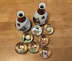 長年の習慣ではあったが、文化として徳利に入れてセットの猪口で飲むという方法がとられていることを考えると、私みたいに目の前にある盃をすぐに飲み干してしまうタイプには、そっちもいいのではと考えはじめ、正月用にどこかの家で使われずに眠っていた九谷の七福神のセットを買ってきた。